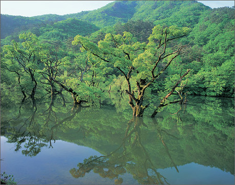 청송 주산지의 신록