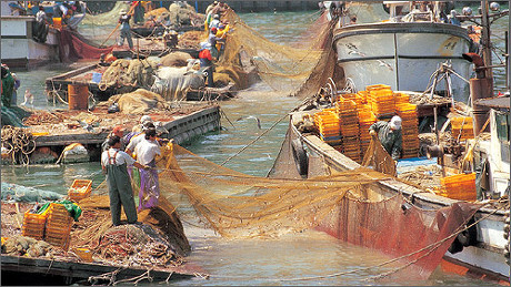 남해군 물건항의 멸치털이